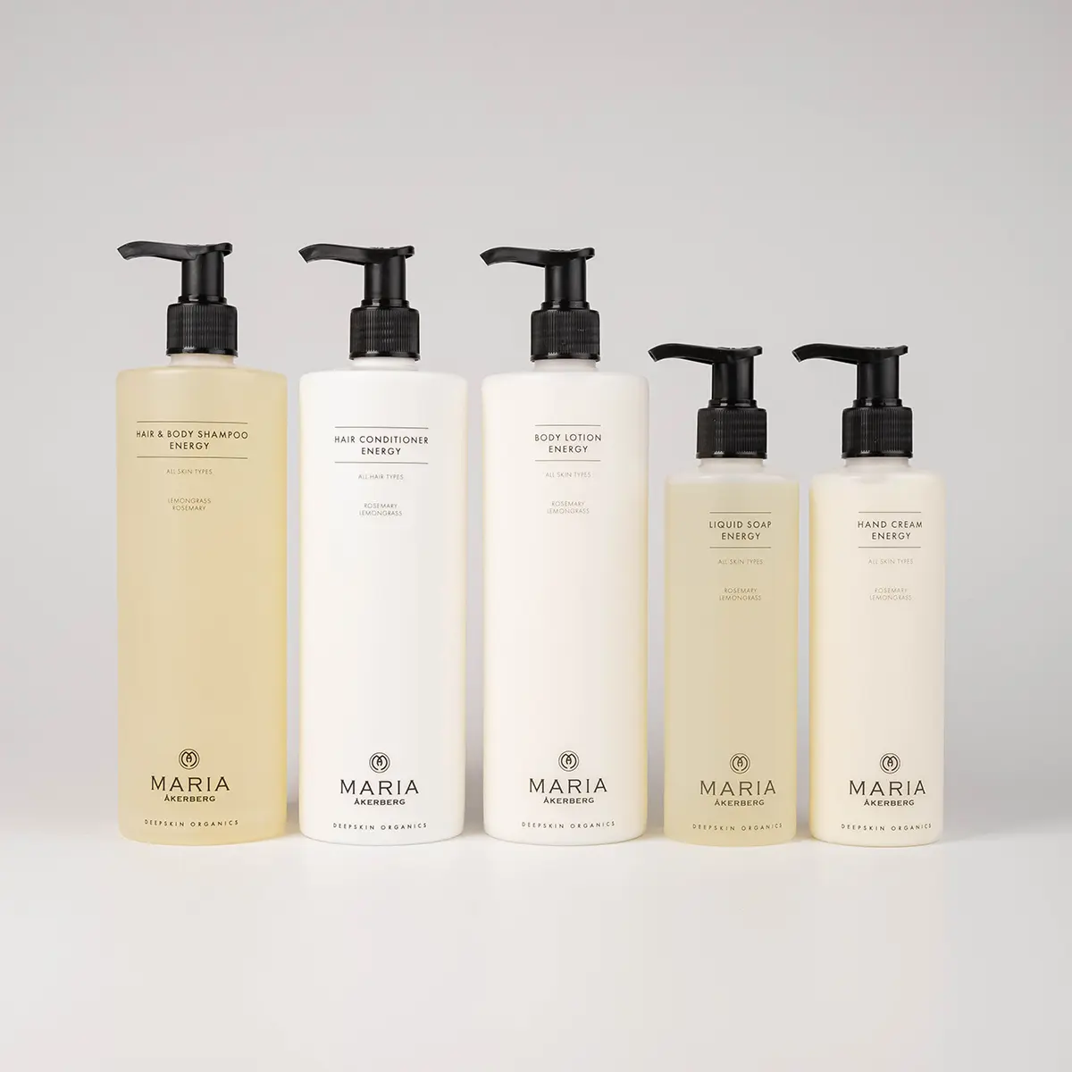 ENERGY-serien består av schampo/duschgel, balsam, kroppspeeling, body lotion, handtvål och handkräm - förpackade i våra stilrena flaskor och tuber, tillverkade av 100% bioplast.